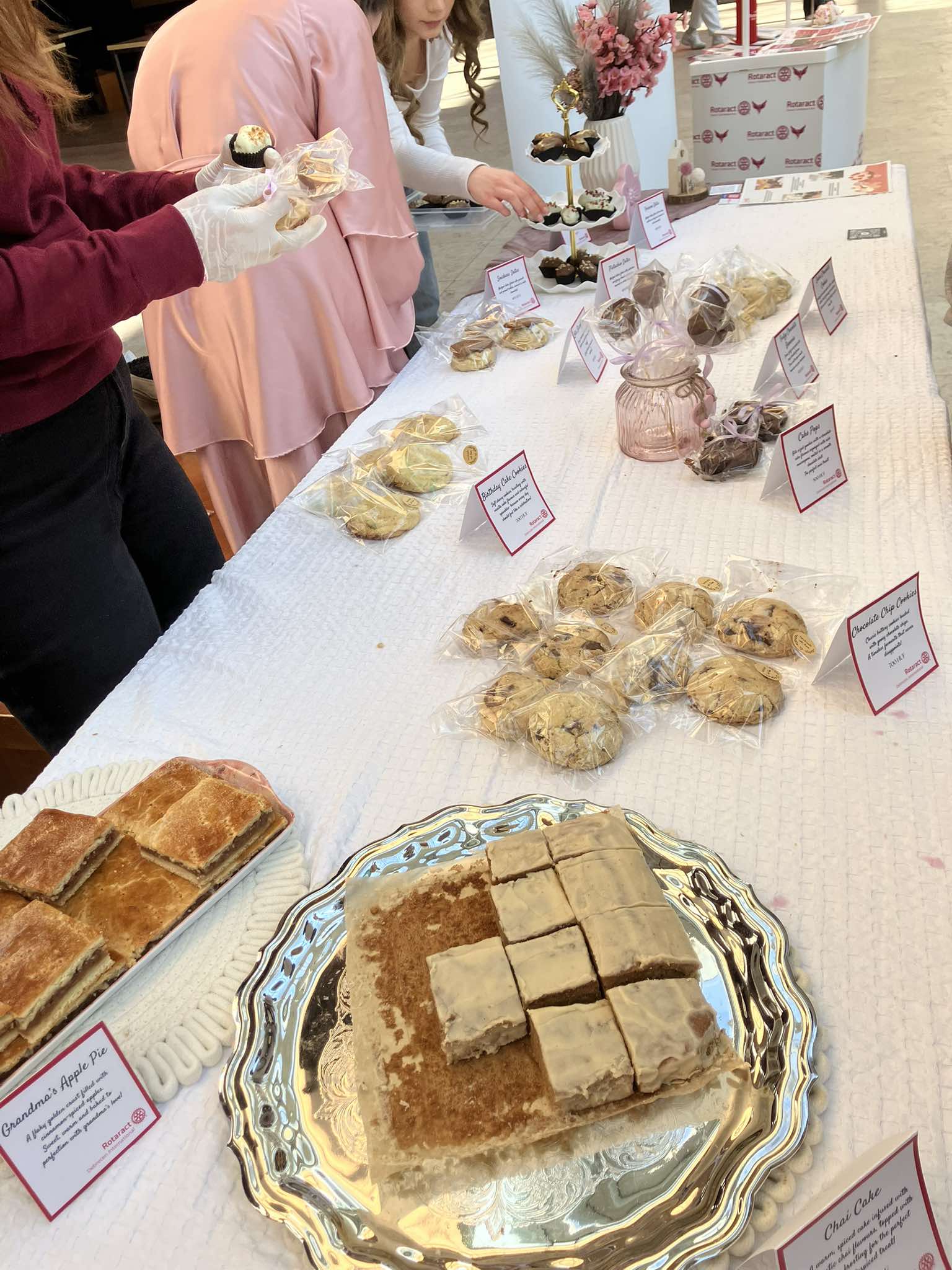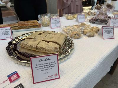 Az International tagjai saját kezűleg készítettek ínycsiklandó süteményeket, amik közül az adományozók adományaikért cserébe választhattak. Az édességek óriási sikert arattak, és a klubtagoknak nem kellett amiatt aggódniuk, hogy vajon ki vigye haza a maradékot. A választék között megjelentek a jól bevált ízek is, mint például a nagymama almás sütije vagy a csokis keksz, de különlegességeket is kóstolhattunk, mint a chai szeletet és a fahéjas-vaníliás csigát. A sütik mellé klubunk mindenkinek biztosított egy pohár meleg teát is.